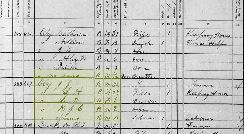 The good thing, though, is that this combination of initials works for me. K J C Eley is Kennith John Cephas Eley and his father J J Eley is Jacob J. Eley. I still don’t know, even through subsequent census listings, the actual spelling of his mother’s name: Lou Adda, Lue_____ Addy.