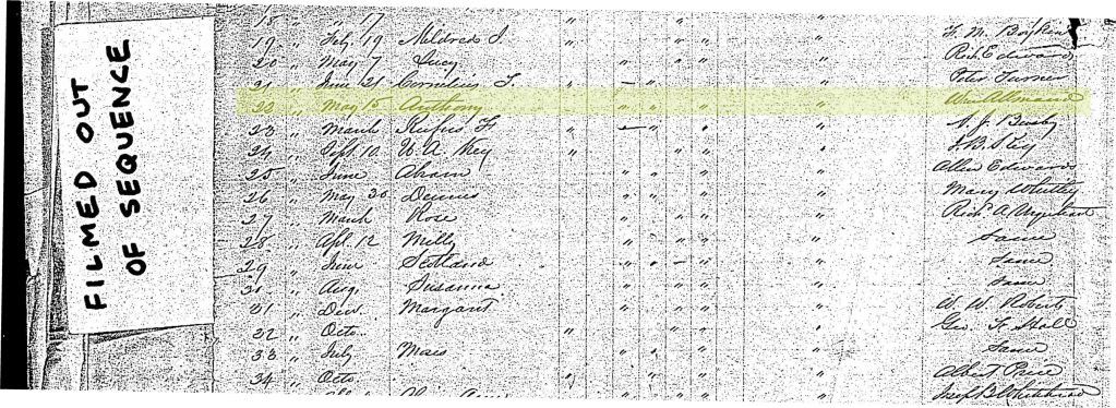 I found the birth record for my 2nd great granduncle Anthony Allmond. He was born May 15, 1853. You can see from the label that the record was “filmed out of sequence”.
