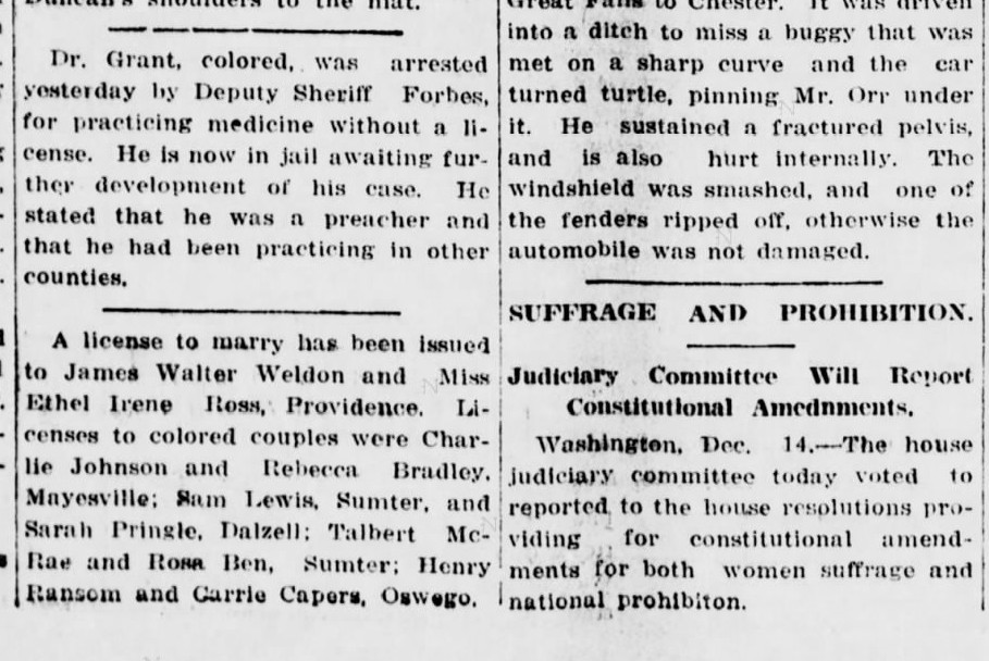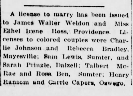 Aside from the census, I have not been able to find many sources about my great-grandparents on the Johnson side so I was happy to find this notice in The Watchman and Southron, Sumter, South Carolina, December 16, 1916.