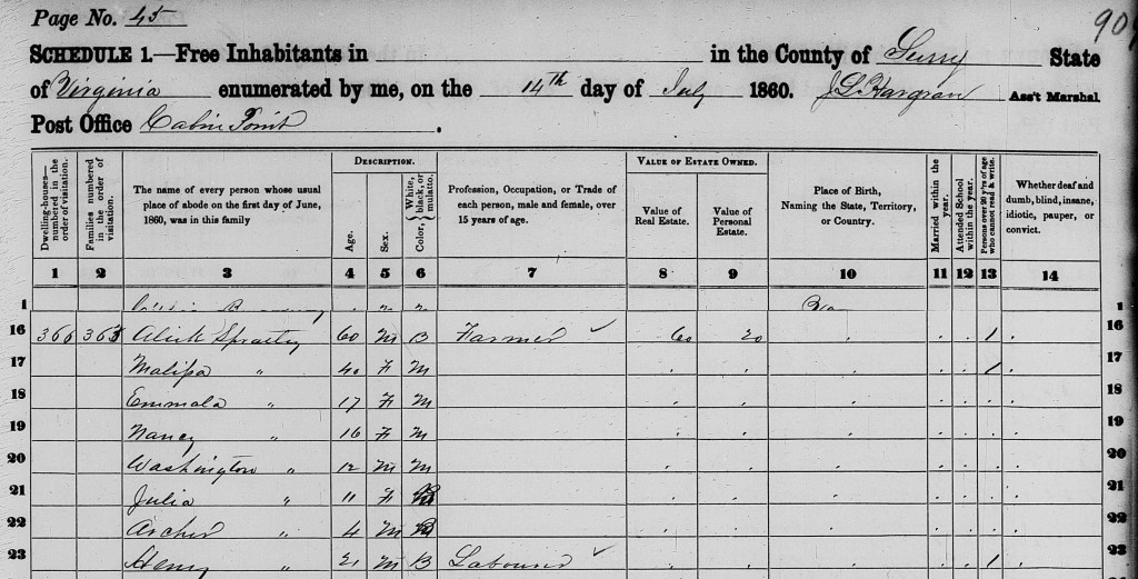 I found my 4th great-grandfather, Alick Spratley, following back on one of my maternal grandmother’s maternal lines. I was so happy to go that far back that it didn’t click that I got his information from the 1850, 1860 and 1870 Censuses in Surry County, Virginia.