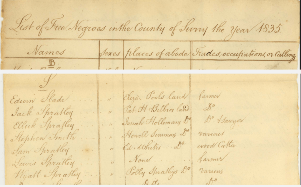 - List of Free Negroes in the County of Surry for the Year 1835, 1835, Virginia Untold: The African American Narrative Digital Collection, Library of Virginia, Richmond, VA