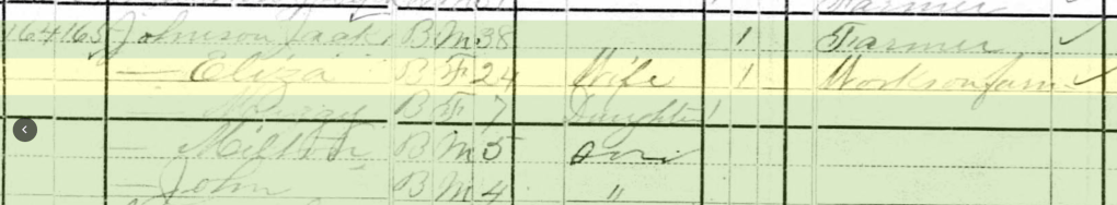 Looking at the 1880 Census, I see Jack and Eliza Johnson’s household had children Maggy, Milton and John.