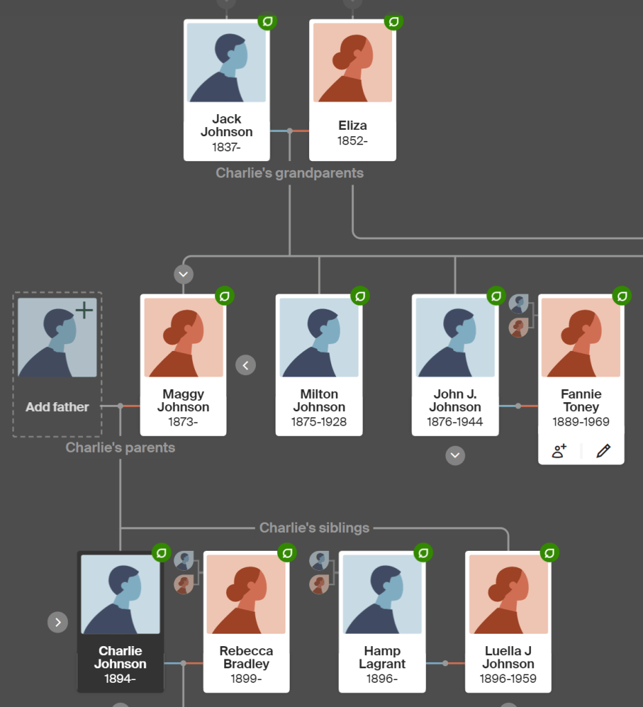 I just broke my whole family tree, well not the whole tree but definitely the Johnson line. Family oral history says that my great-grandfather Charley Johnson was born Charley Lesane but due to circumstances in the South he changed his name to Johnson when he moved to Philadelphia.