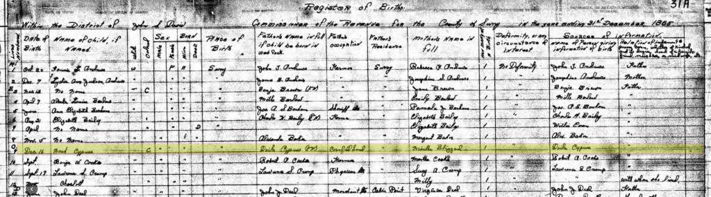 I found this birth record for Noah Cypress, born December 12, 1865, in Surry County, Virginia. Noah was a brother of my 3rd great-grandfather James Cypress. The parents are listed as Doila Cypress and Martha Blizzard.
