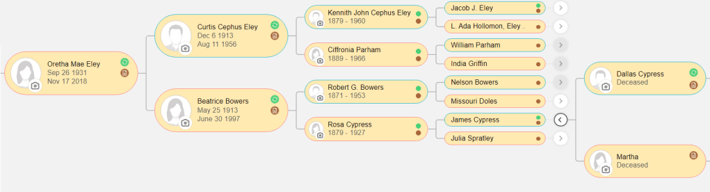 I have recently found the maiden names of two of my female ancestors both on my maternal grandmother’s maternal lines. I can’t tell you how excited I am about this because oftentimes, women’s entire identities were wiped away when they got married. The first one is my 4th great-grandmother Martha Cypress nee Blizzard. Here she is on my My Heritage tree, which I have not yet updated.