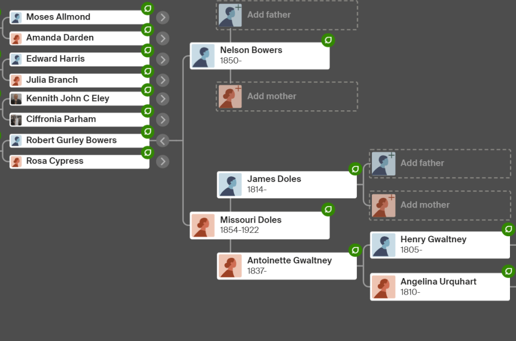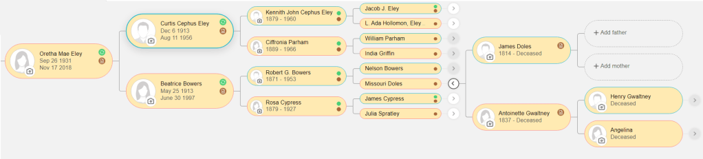 I have recently found the maiden names of two of my female ancestors both on my maternal grandmother’s maternal lines. I can’t tell you how excited I am about this because oftentimes, women’s entire identities were wiped away when they got married. The second one is my 5th great-grandmother Angelina Gwaltney nee Urquhart. Here she is on my MyHeritage tree.