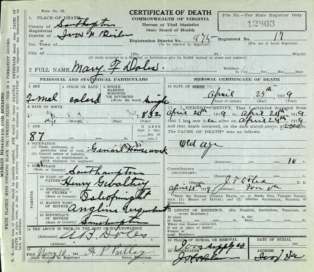 I found a death certificate for Mary Doles, a sister of my 4th great-grandmother Antoinette, who died April 25, 1919, in Southampton County, Virginia. Mary’s parents are listed as Henry Gwaltey and Anglina Urquhart.