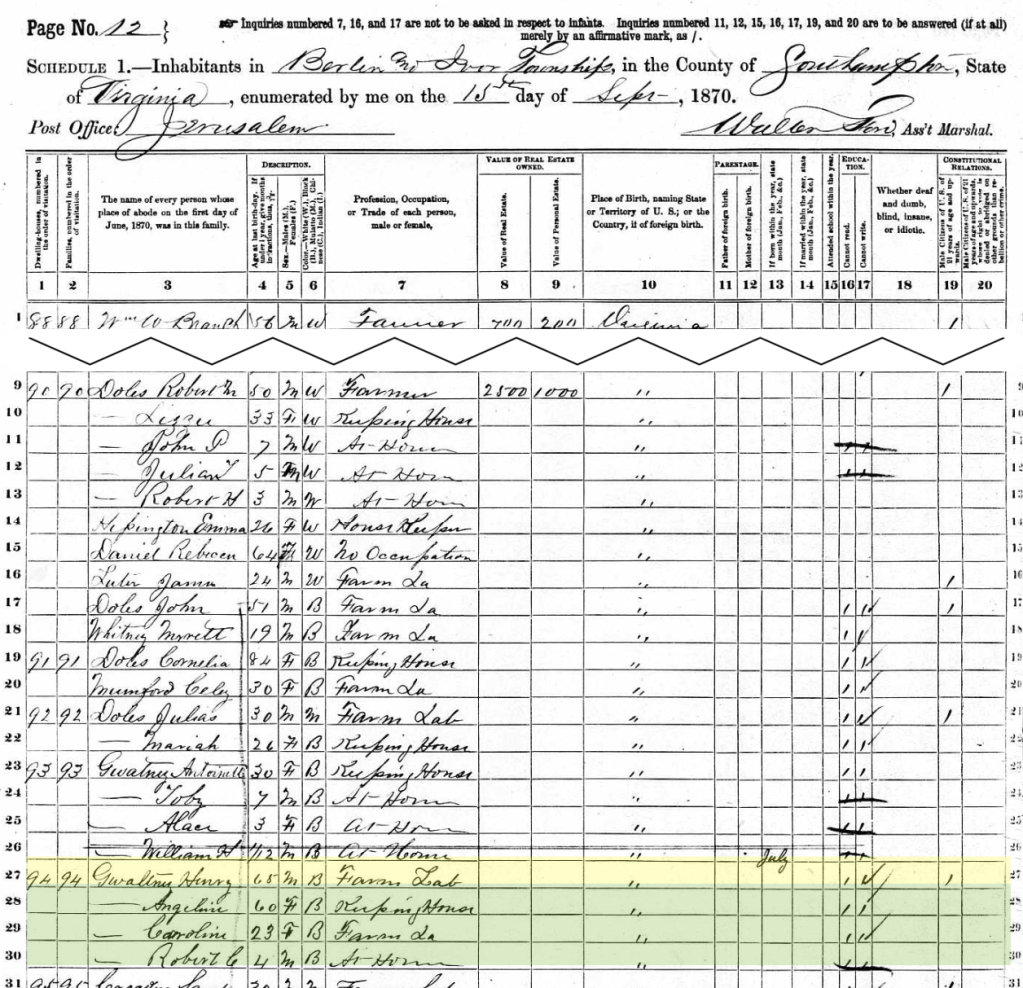 In 1870, Henry and Angelina Gwaltney lived in Jerusalem, Southampton County, Virginia. Their daughter (my 3rd great-grandmother) Antoinette Gwaltney was 30 years old and right next door.