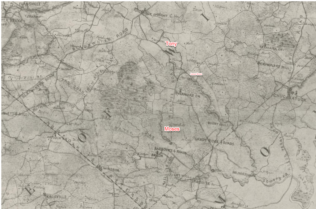 Here’s a Civil War map of Isle of Wight County and part of Nansemond County. In the image, I have labeled where Jones Grove Baptist Church is as well as where Tony and Moses Allmond’s lands were 30-40 years later.