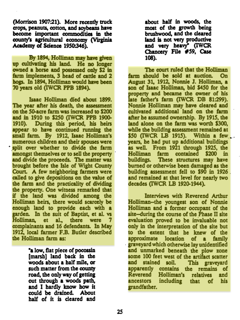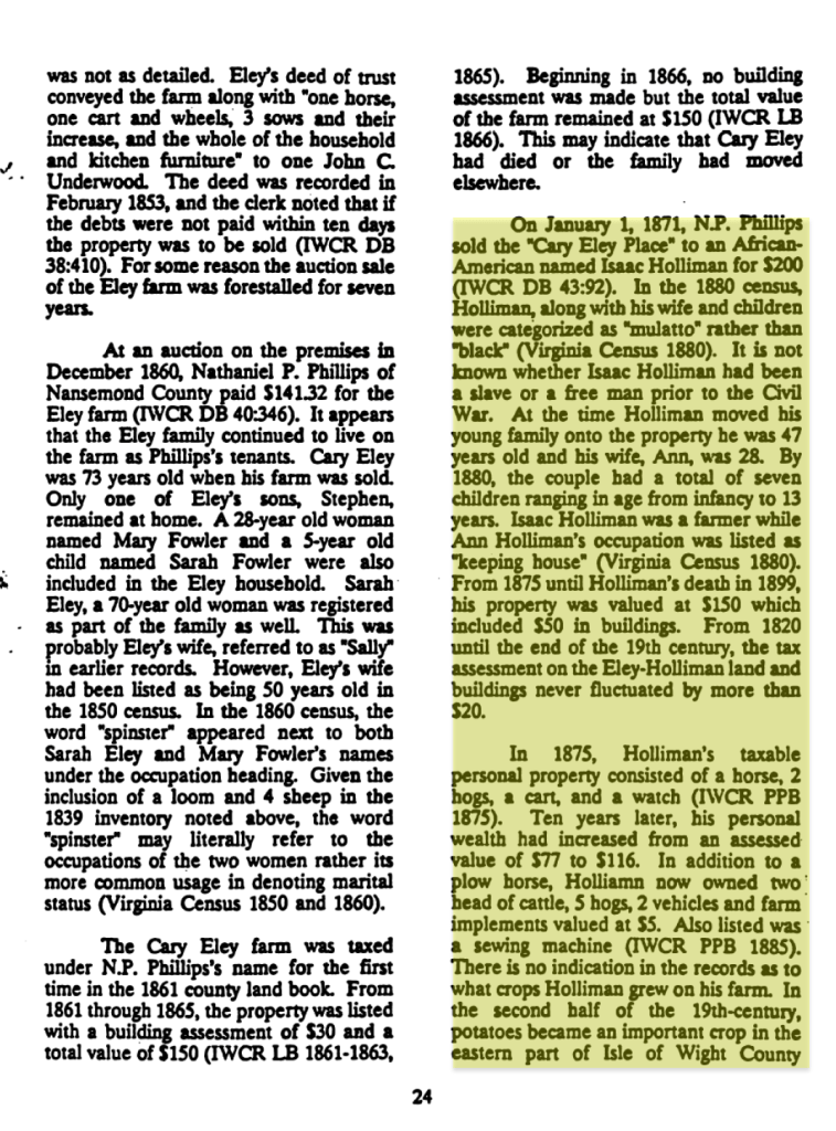 In 1870, Isaac Holleman purchased 50 acres in Windsor, near the Nansemond County line. He and his wife Ann raised their family there, and the land remained in the Holliman family until the 1960s. Although it had not been inhabited since a catastrophic fire in 1944, the land endured.