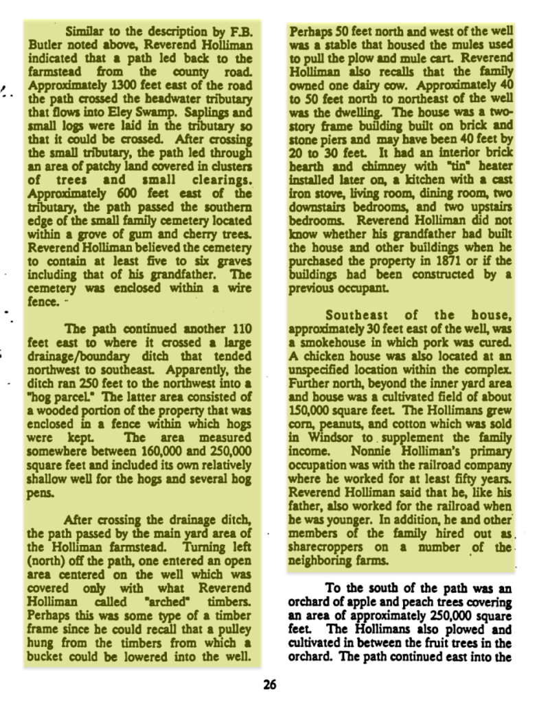 - Oral History: Interviews with a former occupant, Reverend Arthur Holliman, provided critical information regarding the farmstead’s spatial layout, subsistence activities, and the location of a family graveyard.